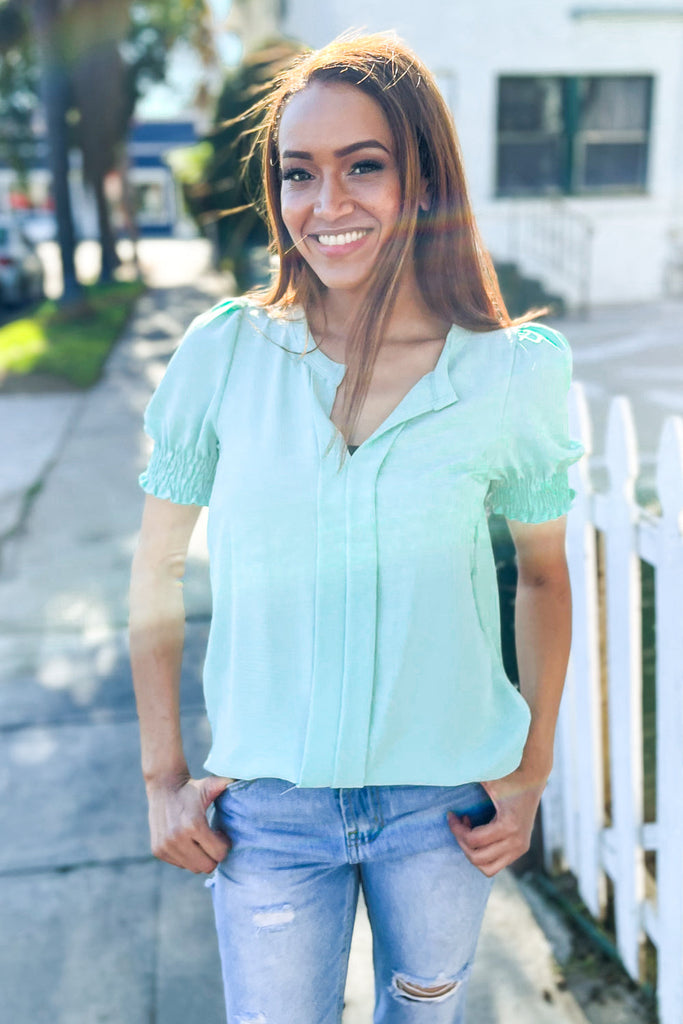 Spring Vibes Mint Wavy Rib Puff Short Sleeves Floral Top