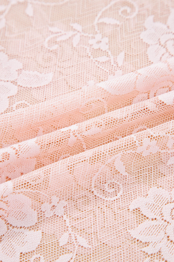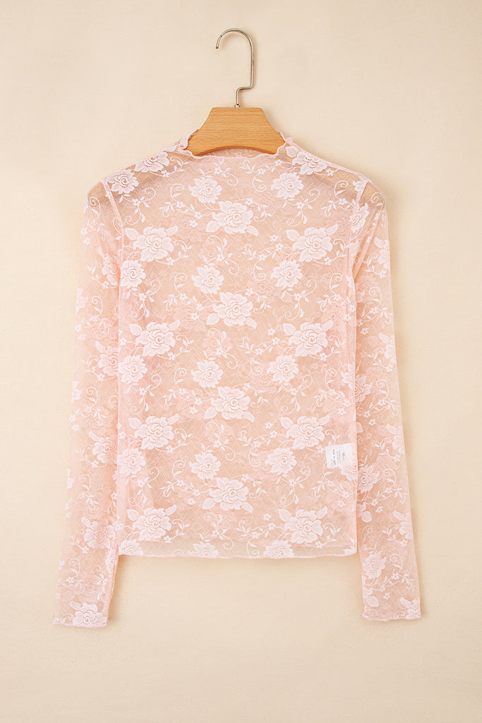 Apricot Pink Sheer Floral Lace Mesh Mock Neck Long Sleeve Top