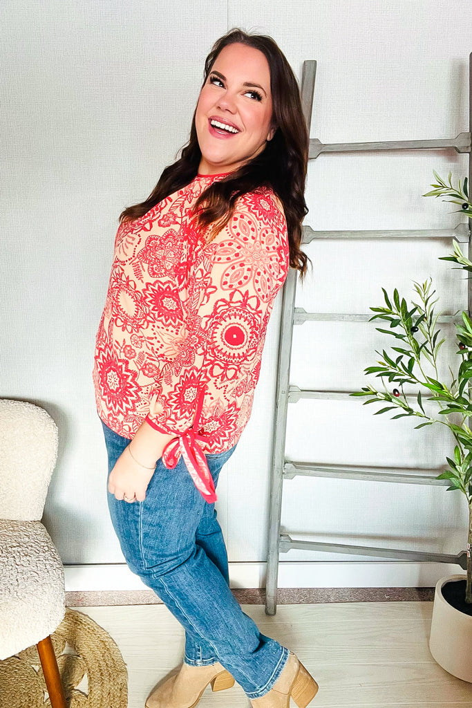 Be Bold Red & Coral Floral Long Sleeve Bow Tie Contrast Binding Top