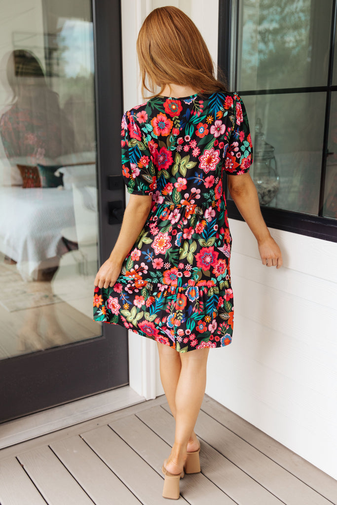 Experience the beauty of summer days wearing the Be Someone Floral Dress! Featuring a self-tie keyhole neckline closure, puff sleeve, tiered skirt, and bright floral print on a black background, this dress has it all - even pockets! Enjoy the sunshine in vibrant style.