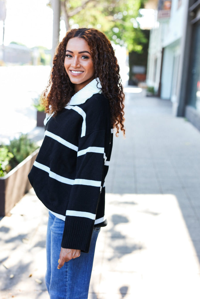 Fall For You Black Stripe Notched Neck Collared Oversized Sweater