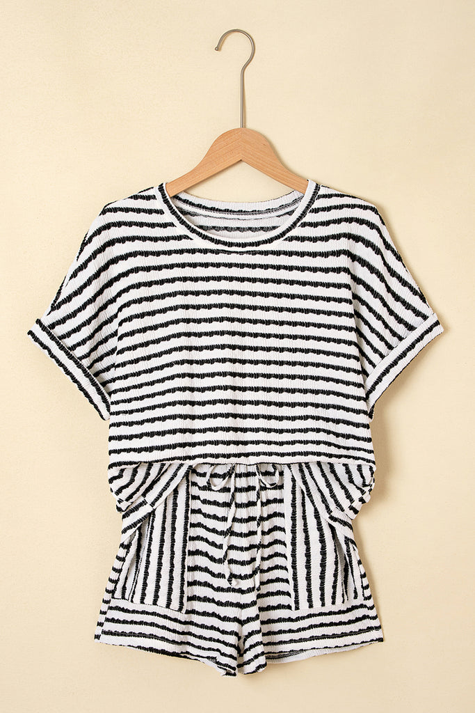 Black Stripe Knitted Short Sleeve Top and Drawstring Shorts Set