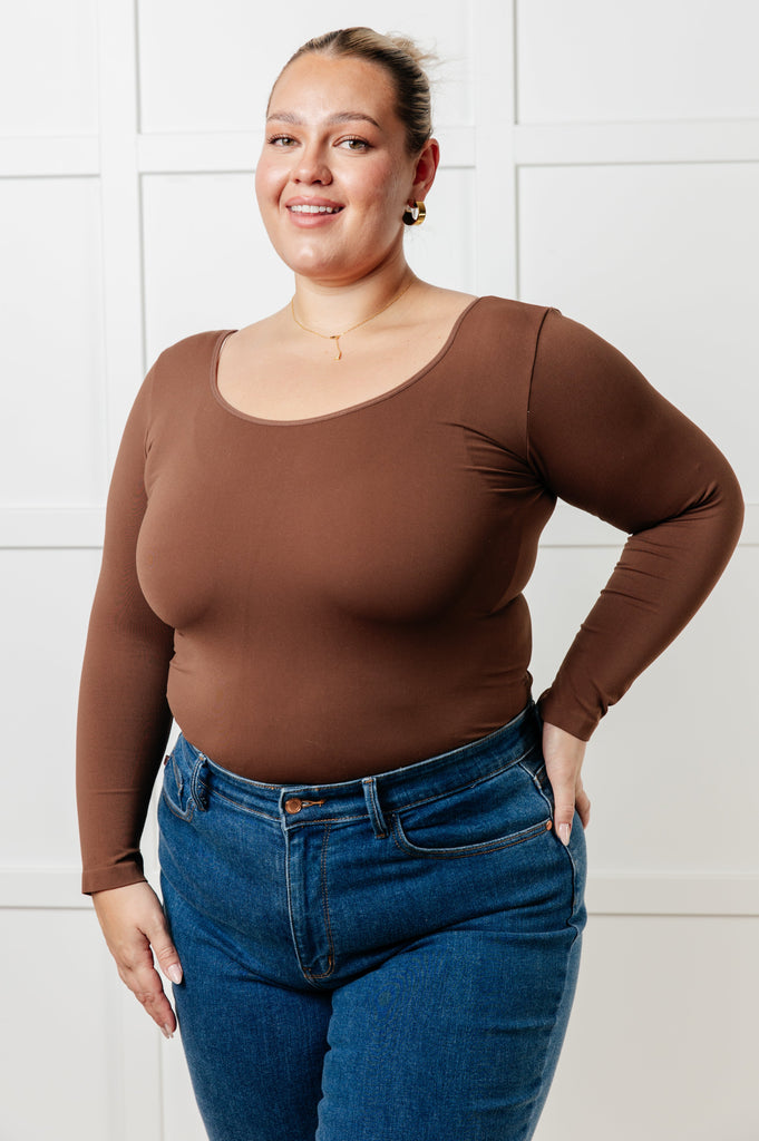 Get cozy in our Bring in the Basics Scoop Neck Long Sleeve Top! Made with brushed microfiber for extra softness, this top is reversible, giving you two looks in one. The scoop/v-neckline adds a touch of versatility, while the long sleeves and form-fitting style provide comfort and a flattering fit. Perfect for all your basic needs.