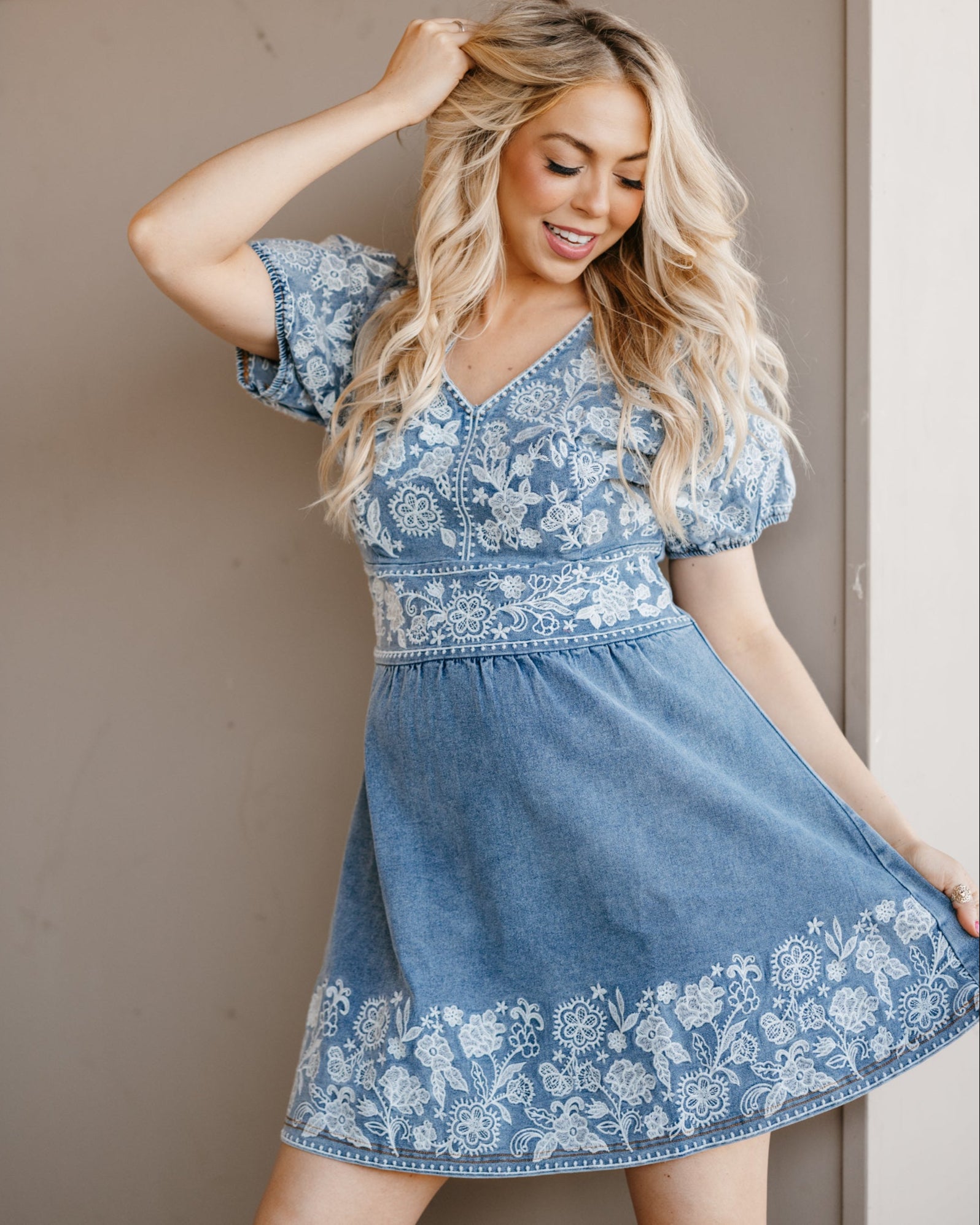 Expertly designed for a flattering fit, our Denim Fit and Flare Dress features elegant puff sleeves and intricate tonal embroidered detailing all over the top and hemline. The back zipper closure and stretchy denim fabric ensure a comfortable and secure fit. Elevate your wardrobe with this versatile and stylish dress.