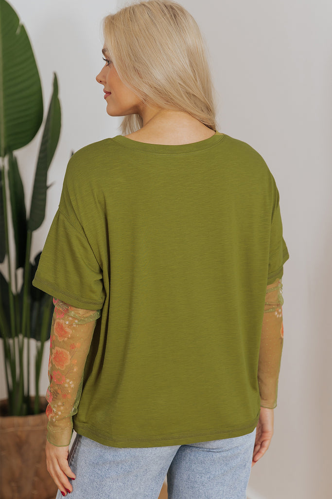 Fern Green Faux Two Piece Floral Long Sleeve Patchwork Tee