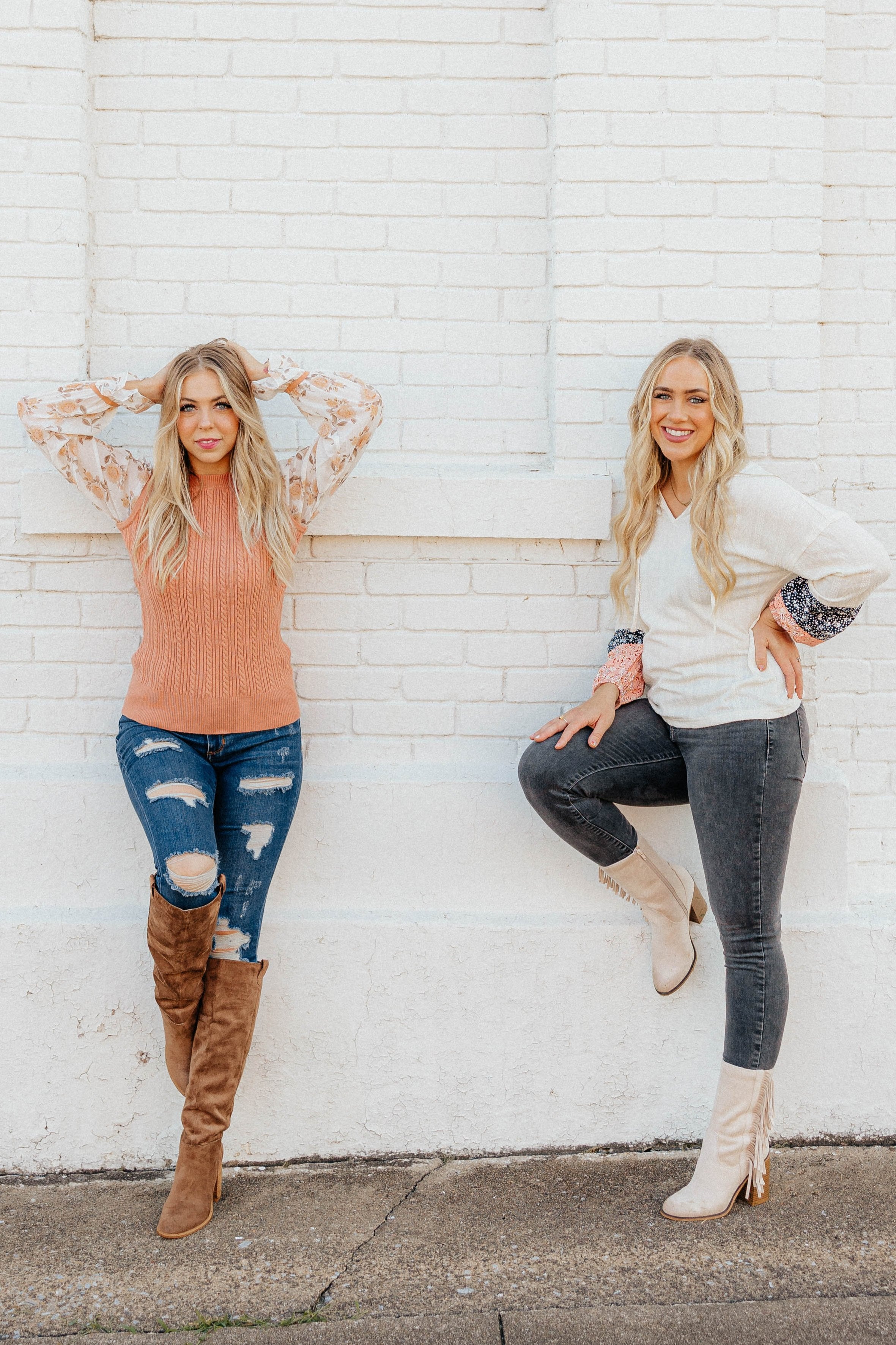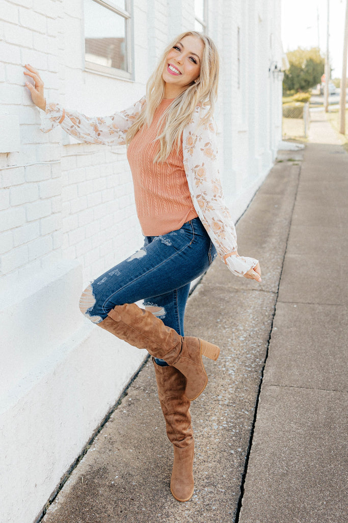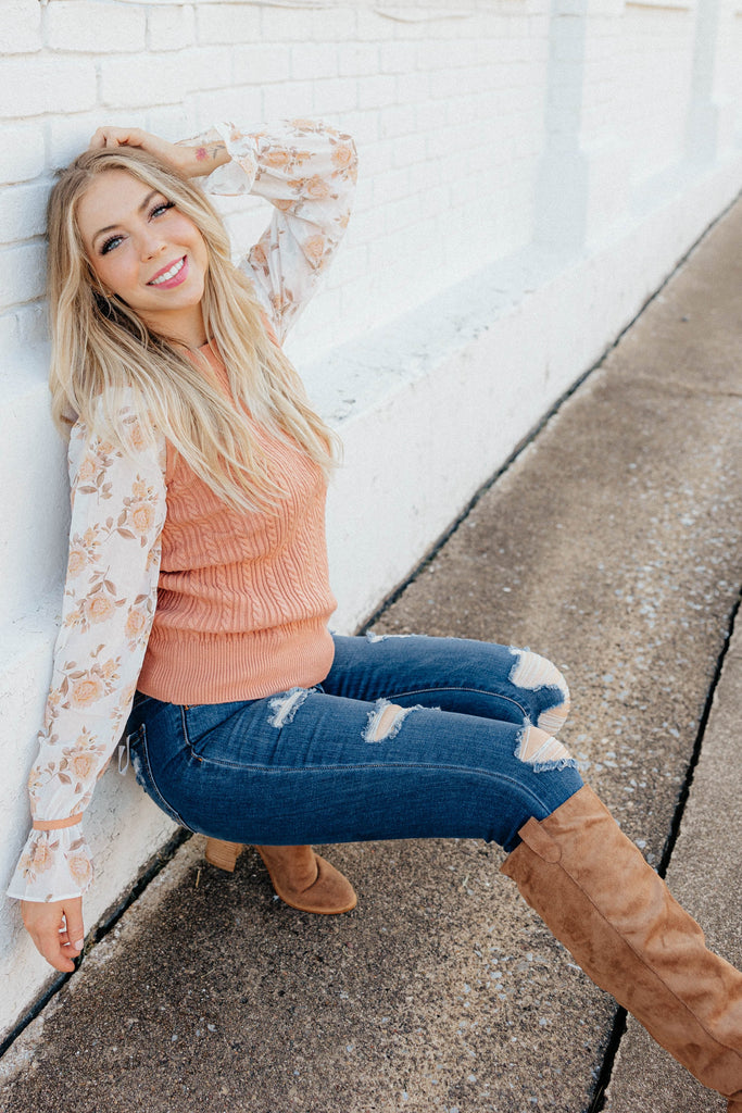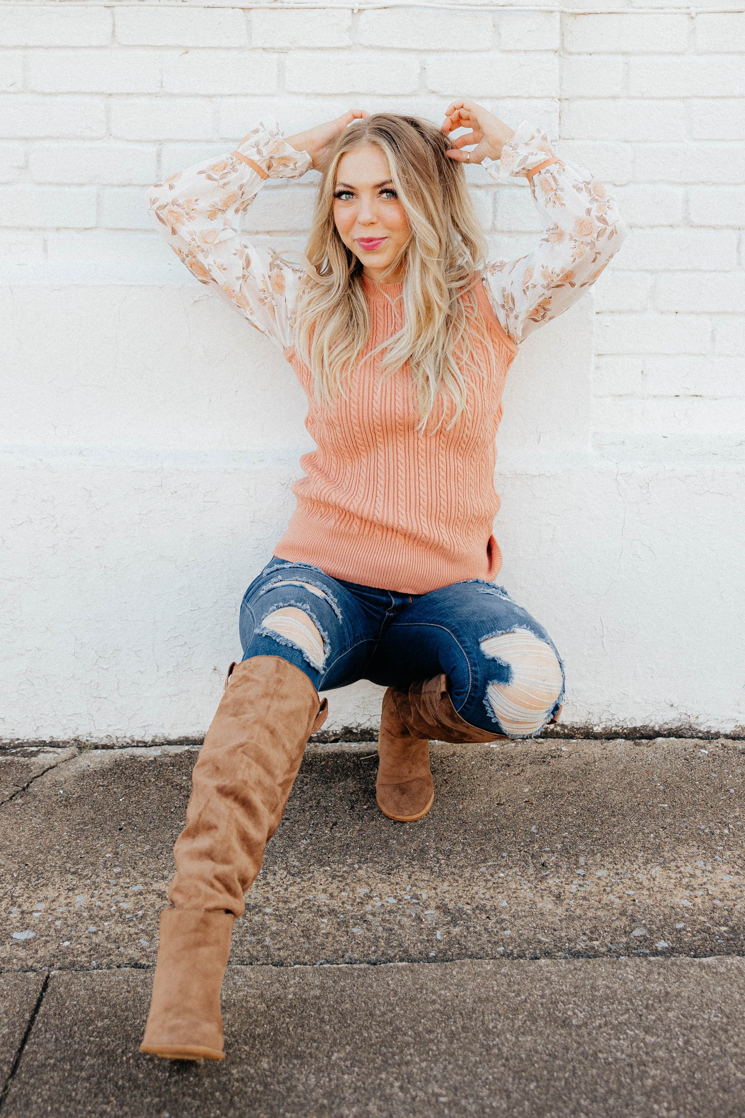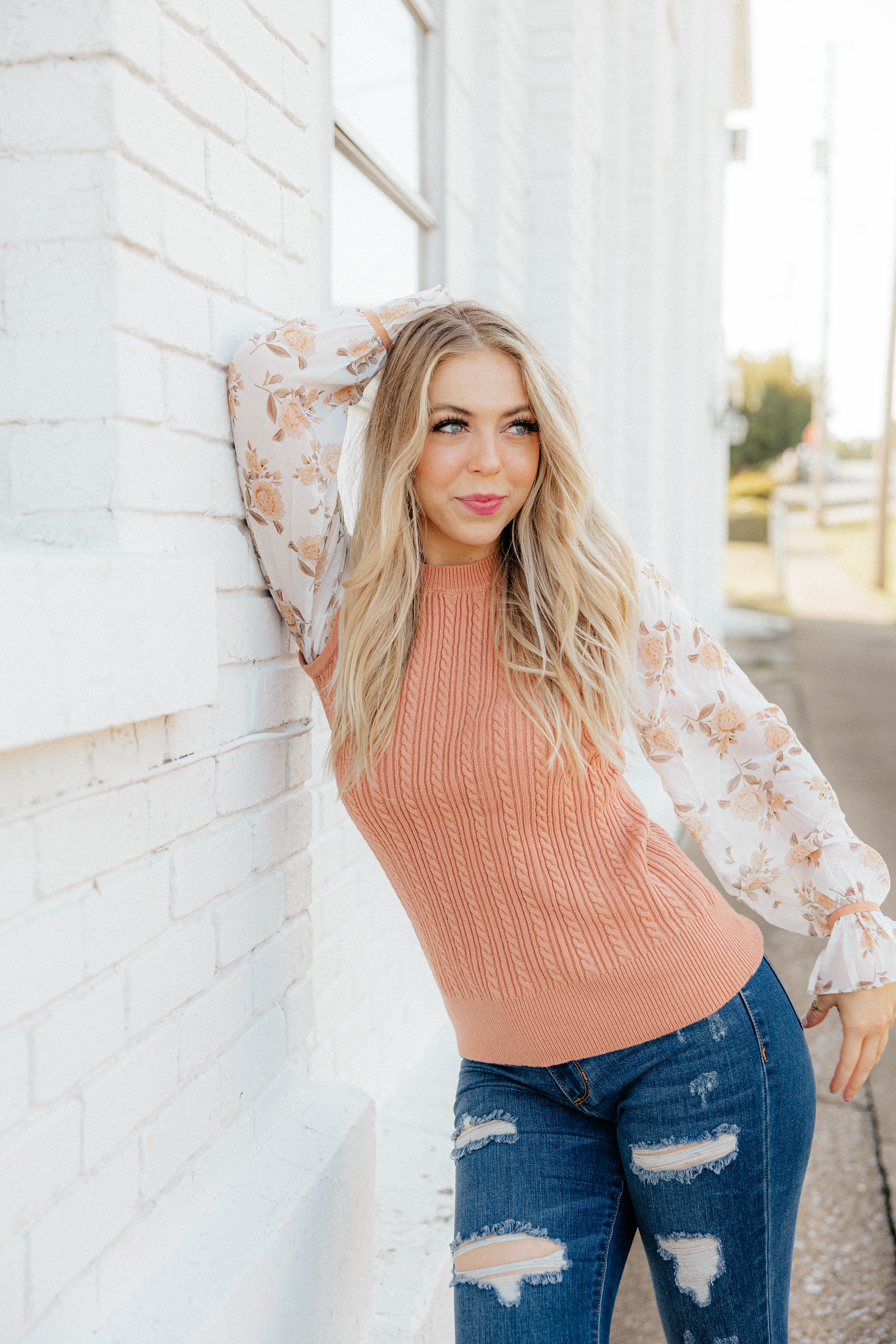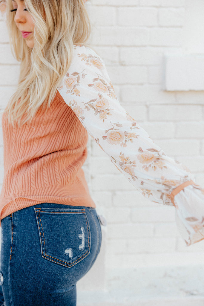 - This knitted sweater features floral print sleeves with ruffled cuffs