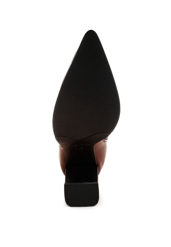 Channel that boss girl energy with these pointy toe faux leather boots. The block heel exudes an elevated vibe while the paneling detail adds a hint of contrast. Team these with your bodycon dresses for a look that demands attention.