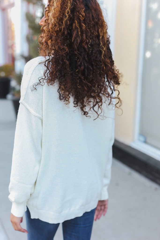 Lock Eyes Ivory Notched Neck With Patch Oversized Sweater