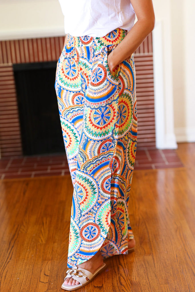 Multicolor Mandala Smocked Waist Side Slit Palazzo Pants