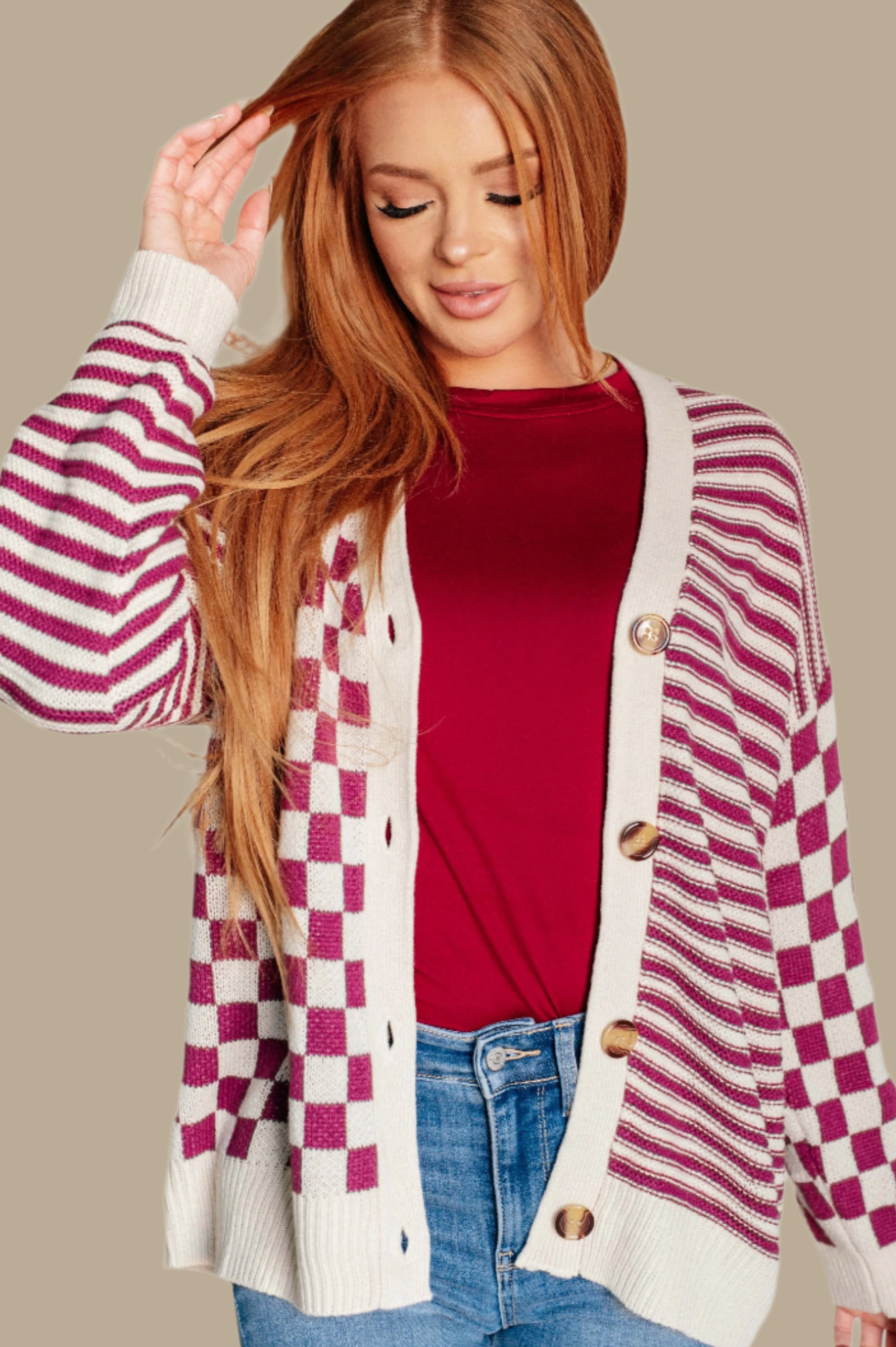 No Brainer Button Down Sweater Knit Cardigan in Magenta/Oatmeal