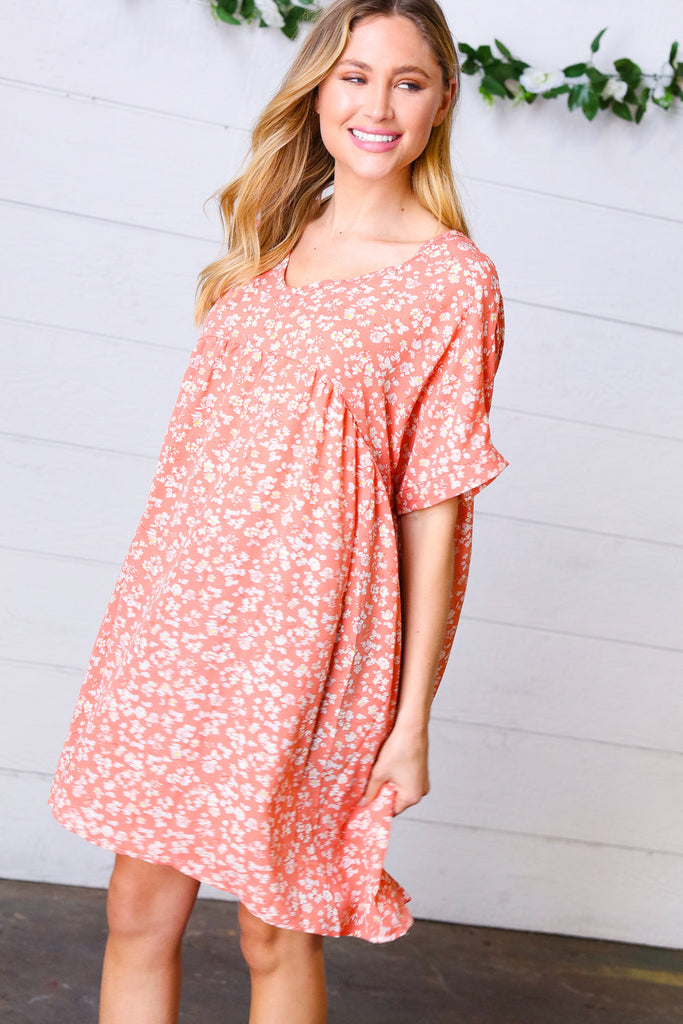 Peach Ditzy Floral Woven Dolman V Neck Dress