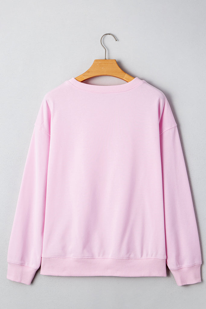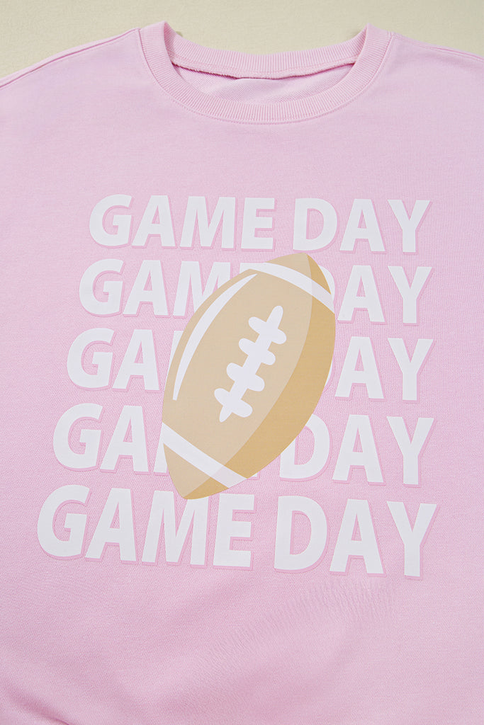 It features pink sweatshirt with cheer up game day rugby graphic pattern front.