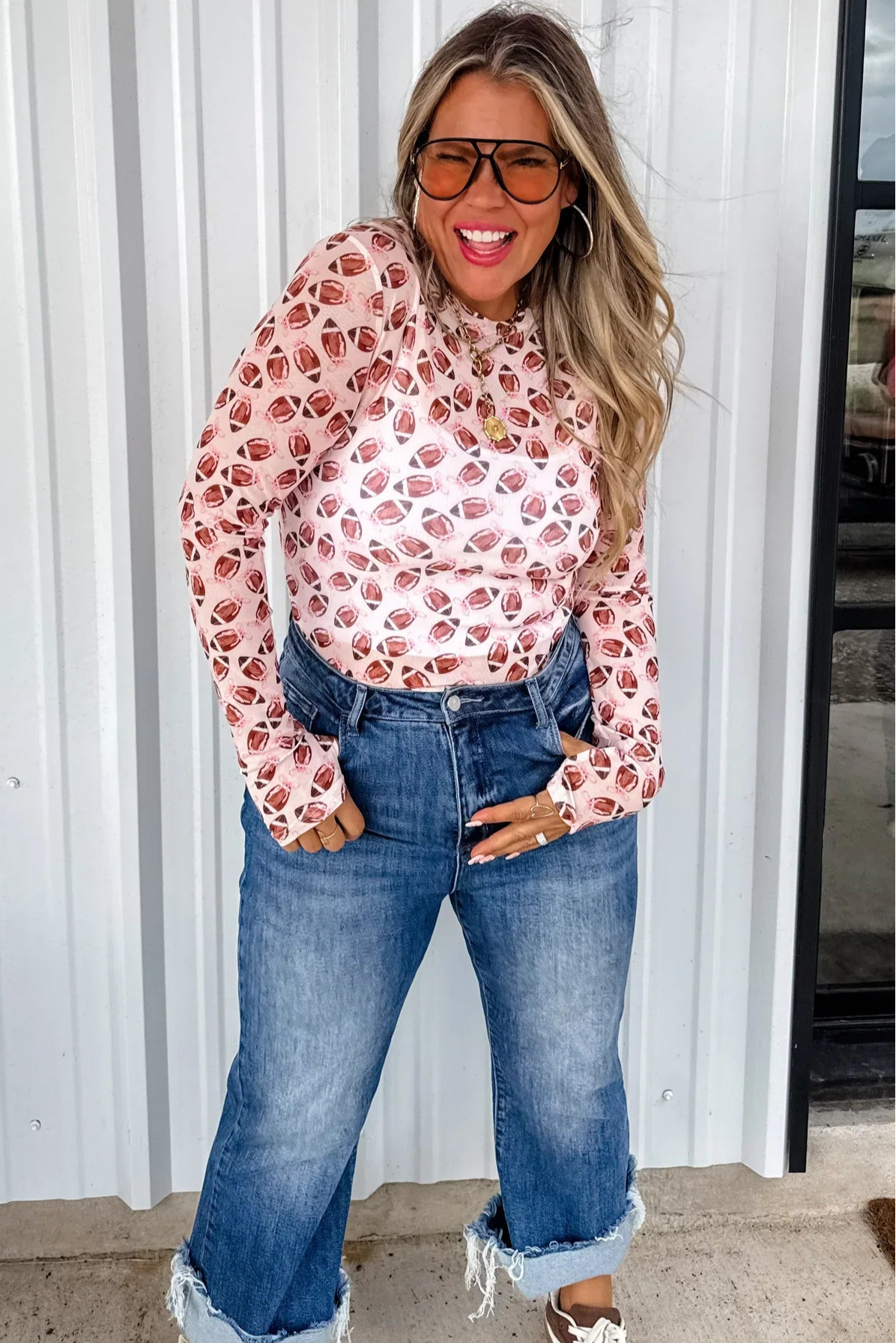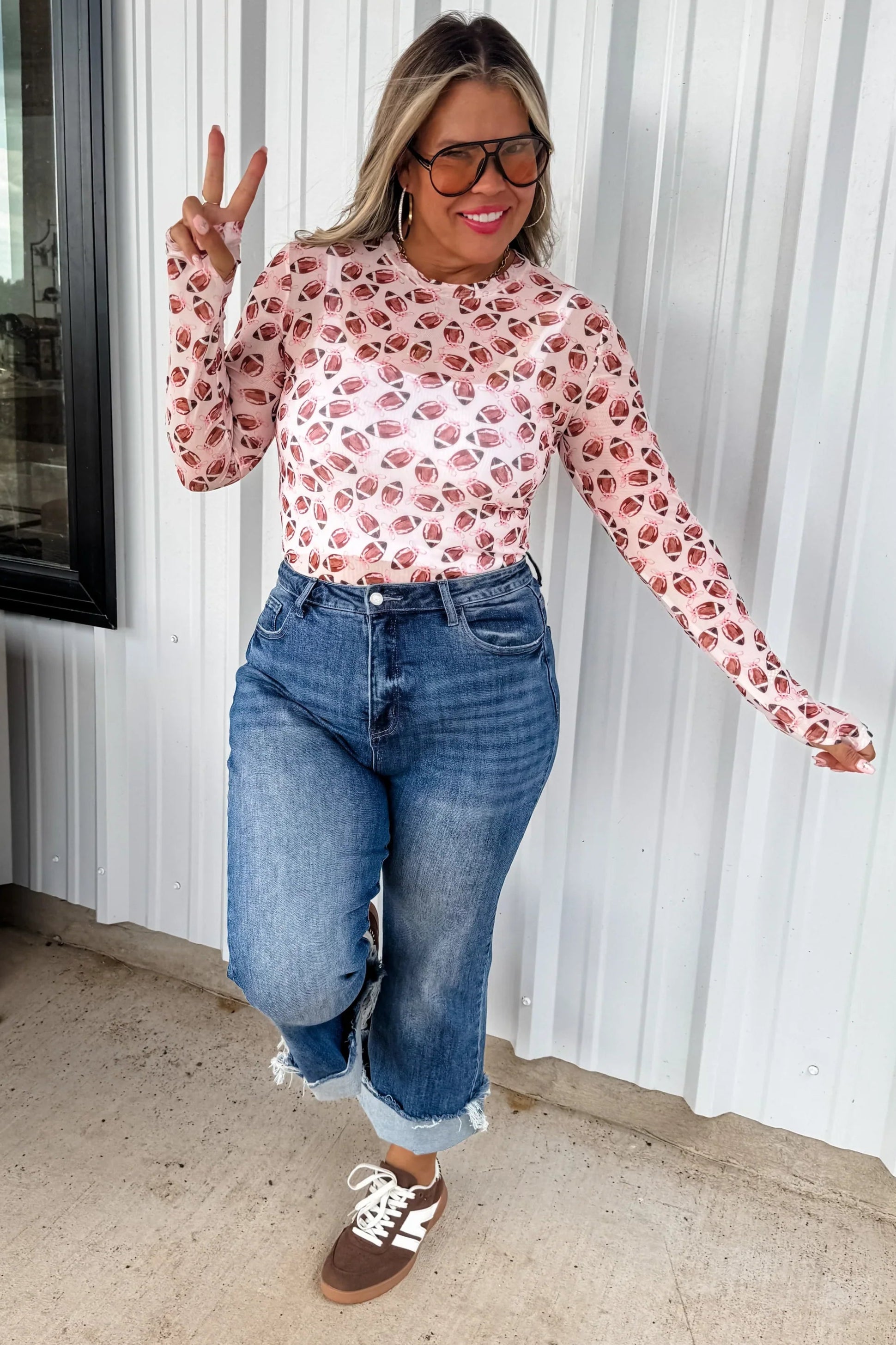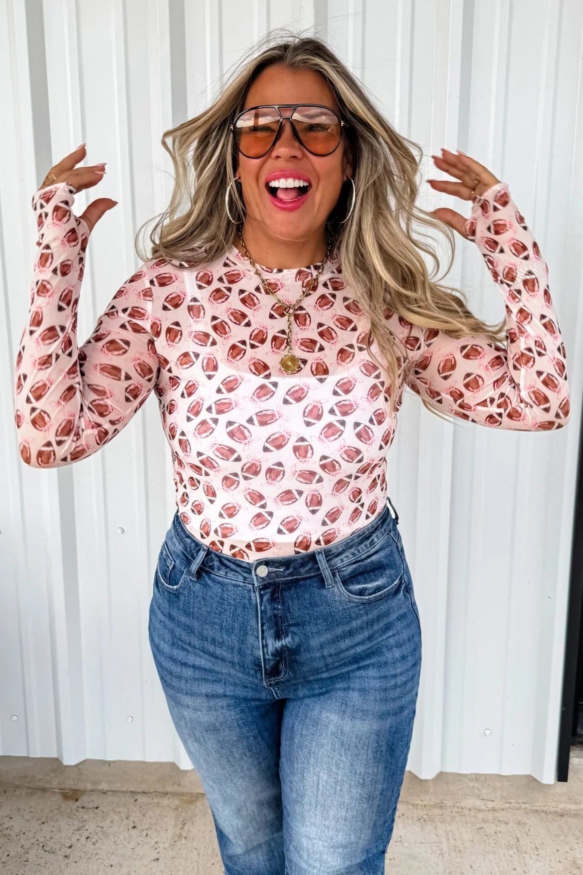 OUR FOOTBALL PRINT IS HERE!! Super cute for layering, this sultry stretchy mesh print long-sleeve top features a totally sheer design. Perfect worn alone or paired under your favorite cardigan, vest or sweater! Crew neck and thumbhole details.