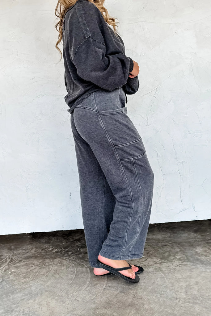 These wide leg pants feature a slight high-rise fit with an adjustable drawstring waistband for all-day comfort. Designed with bold front patch pockets and exposed seam detailing, they offer a casual yet elevated look. The washed terry cotton fabric adds a vintage vibe, while the relaxed wide leg cut keeps them effortlessly cool and easy to style.
