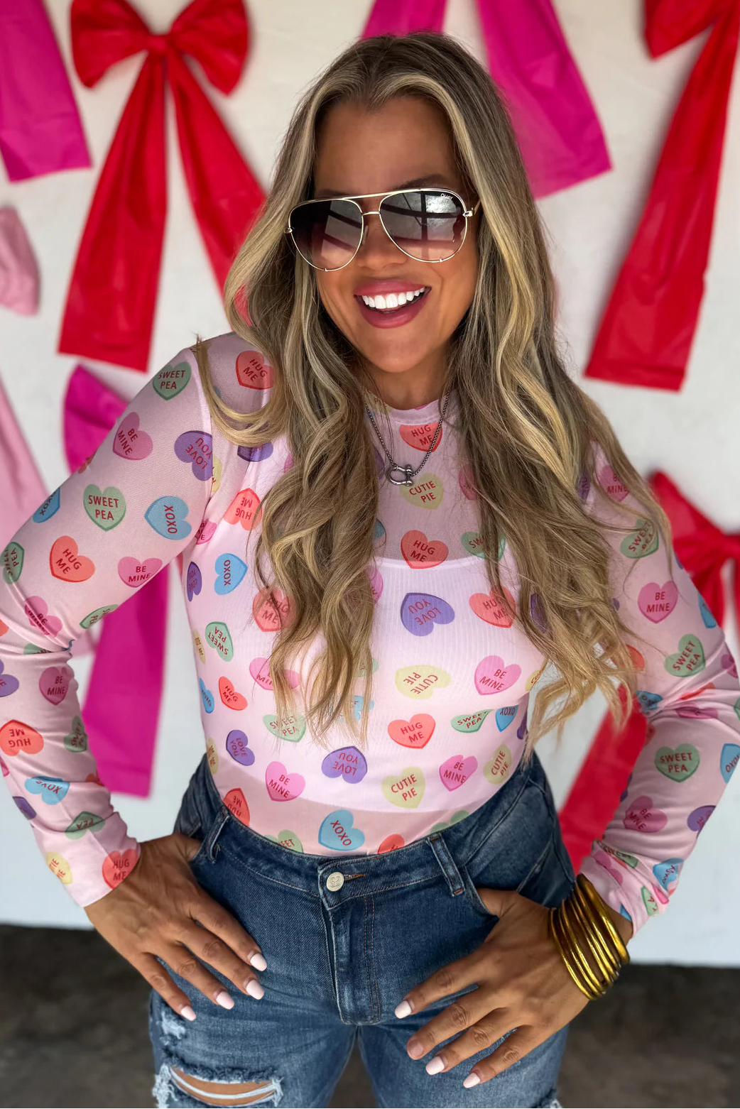 OUR VALENTINES PRINTS ARE HERE!! Super cute for layering, this sultry stretchy mesh print long-sleeve top features a totally sheer design. Perfect worn alone or paired under your favorite cardigan, vest or sweater! Crew neck and thumbhole details.