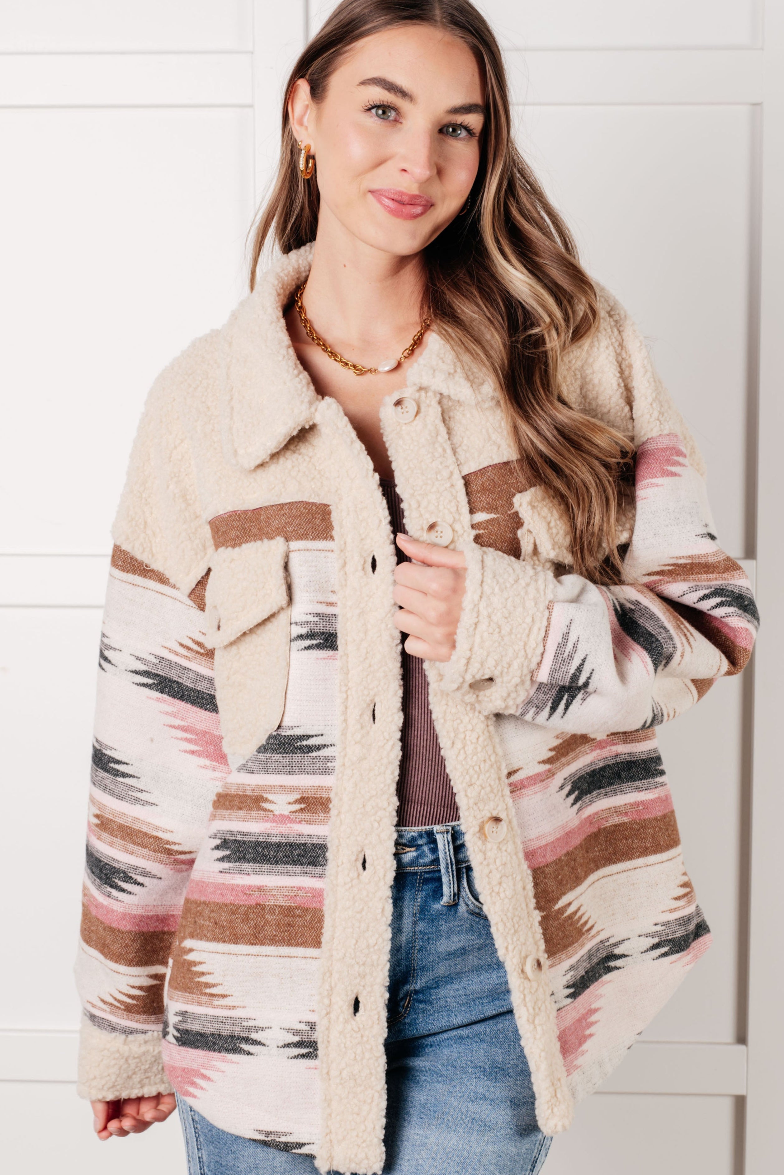Stay cozy and stylish in our Sedona Sunset Shacket. This must-have item features a sherpa fleece panel, classic brushed Aztec patterned woven fabric, and side pockets. Button front closure keeps you snug in the mid to heavy-weight fabric, while the pockets provide convenience. Make a statement with our Sedona Sunset Shacket!