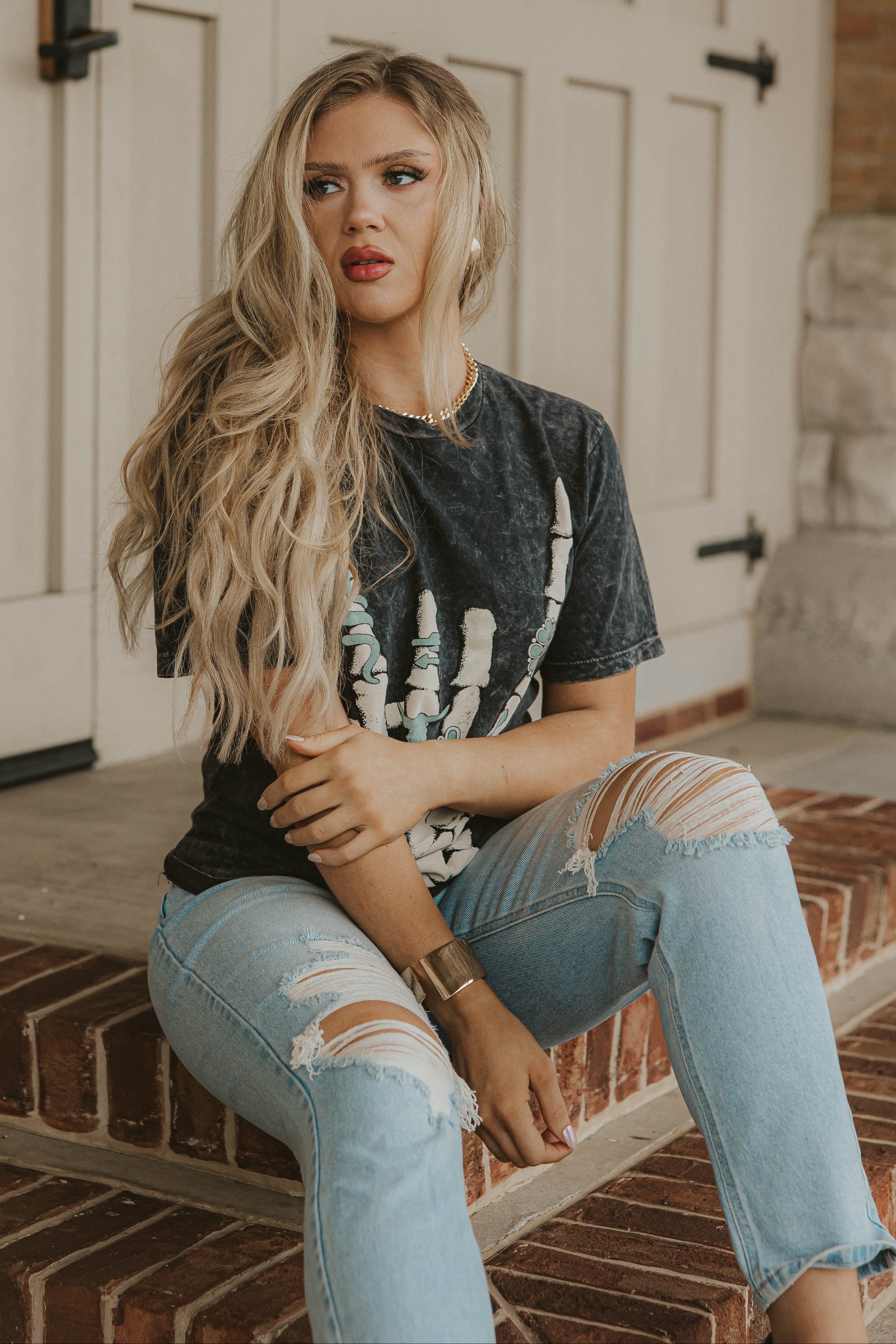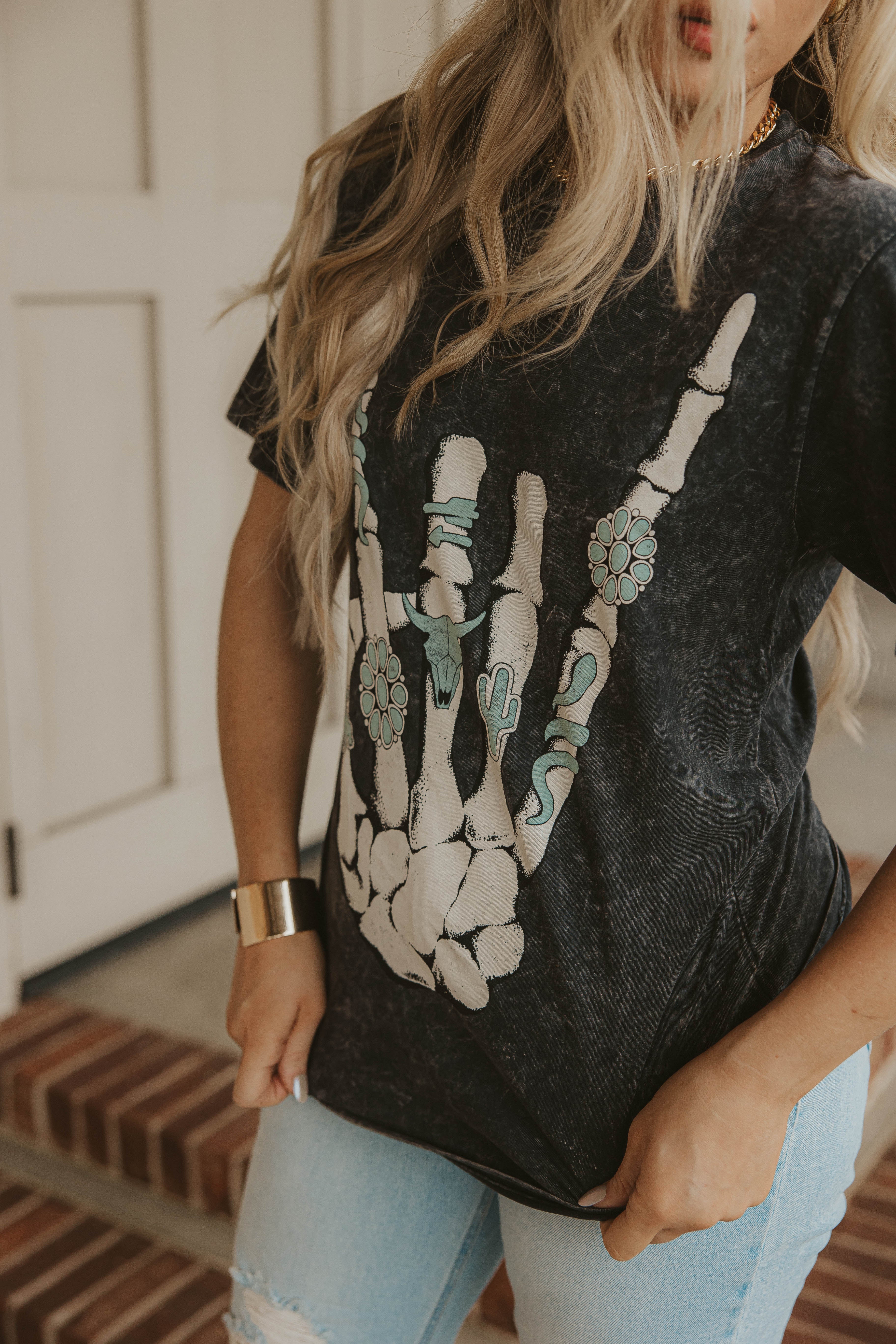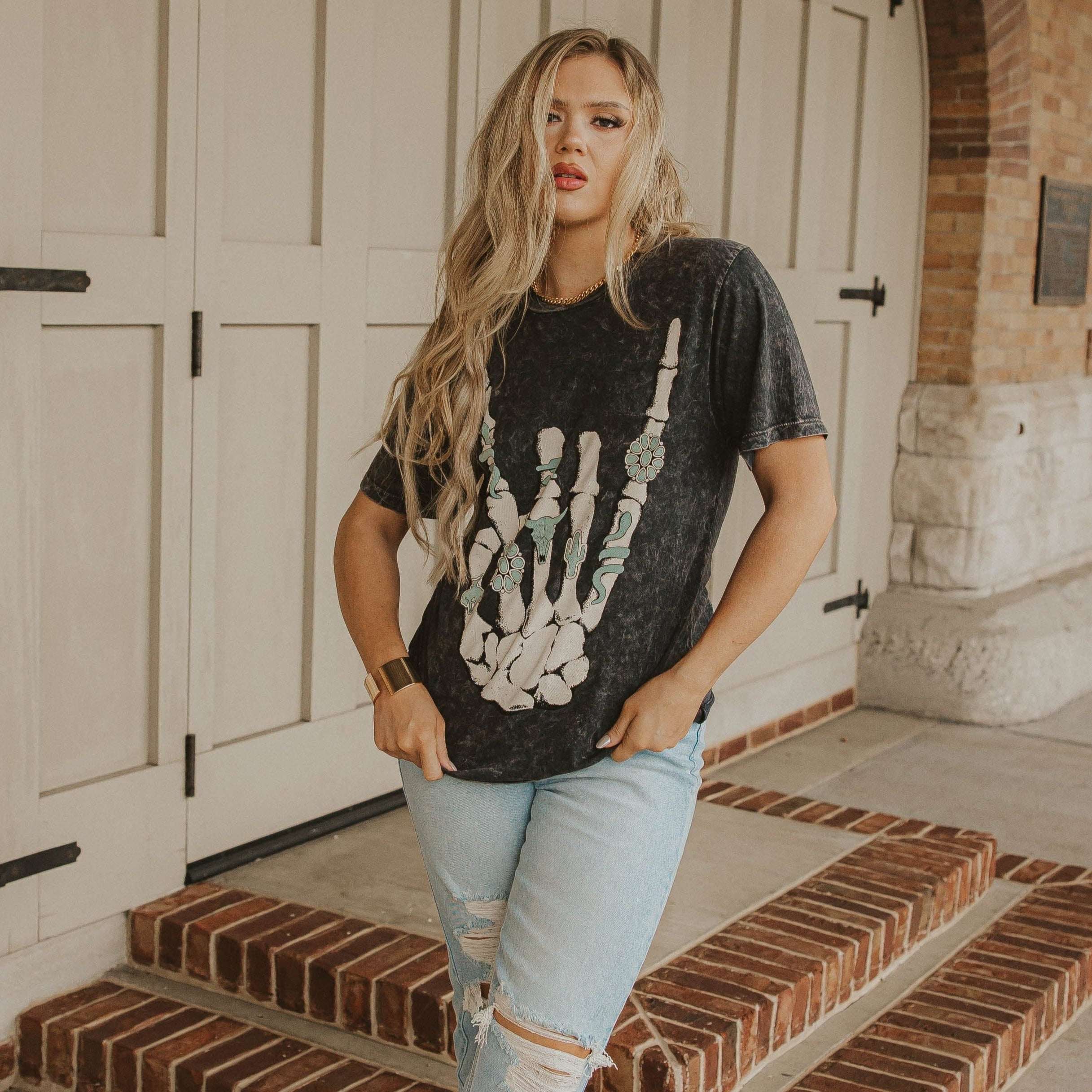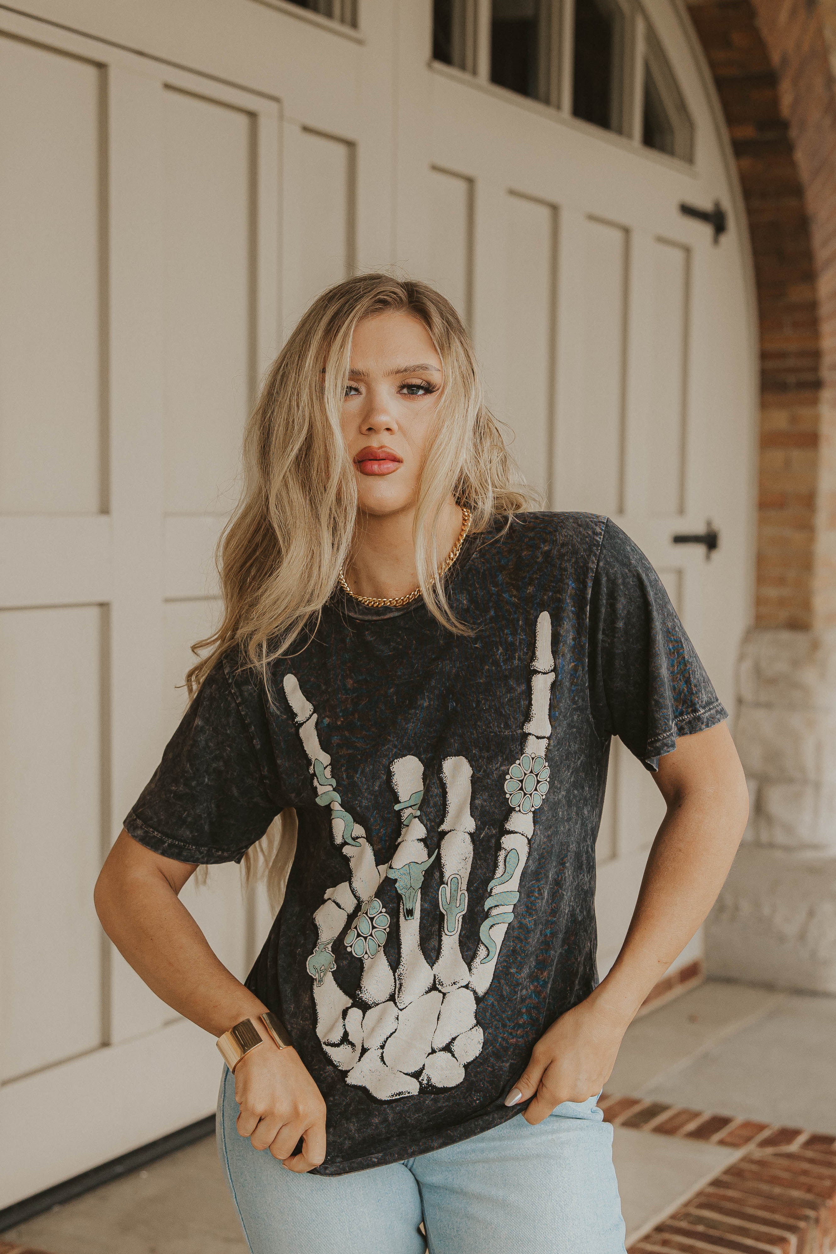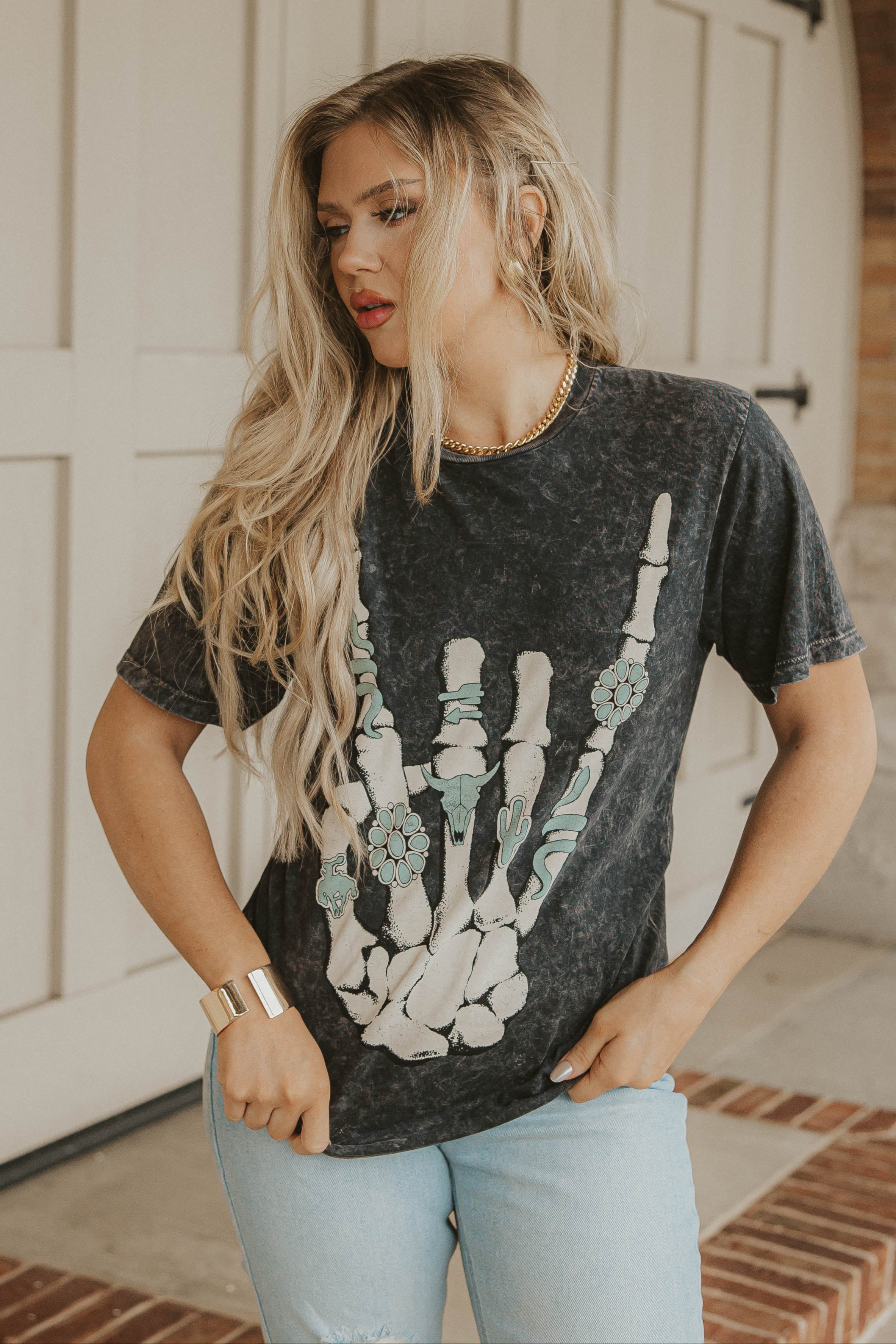 L and XL/1X is a preorder item that will ship 10- 14 days after the order is placed. Skeleton hand with turquoise rings tee (gray) runs true to size. Model typically wears a small and is wearing a small. Size up to Large or X-Large to wear as a dress!