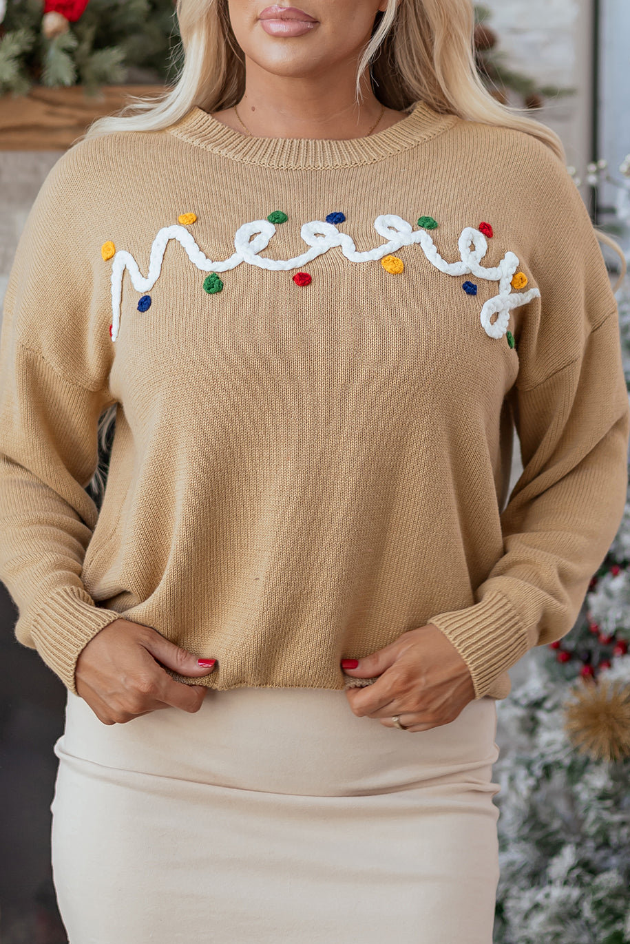 - Cheerful Merry letter adds holiday spirit to your winter wardrobe.