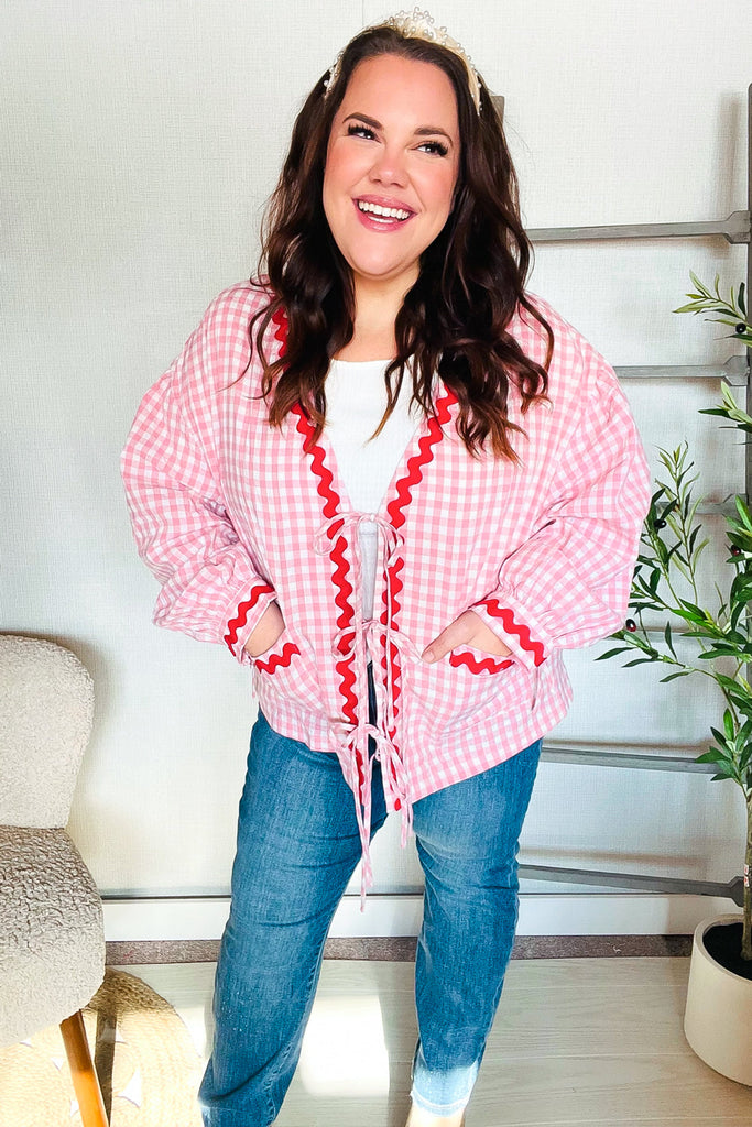 This lightweight, gingham front pocket jacket is a must have for Valentine's that will add instant flair to whatever you layer it with. Made with ribbon bow ties and trendy ric rac trim, be prepared to catch glances!