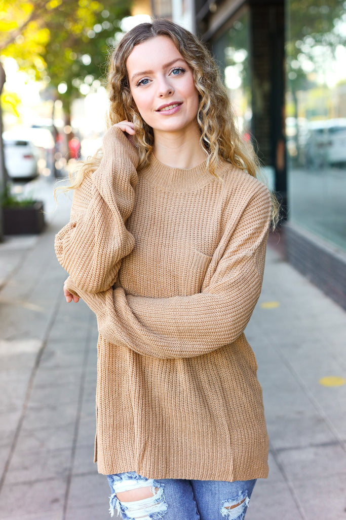 Classy Chic Taupe Mock Neck Chest Pocket Knit Sweater